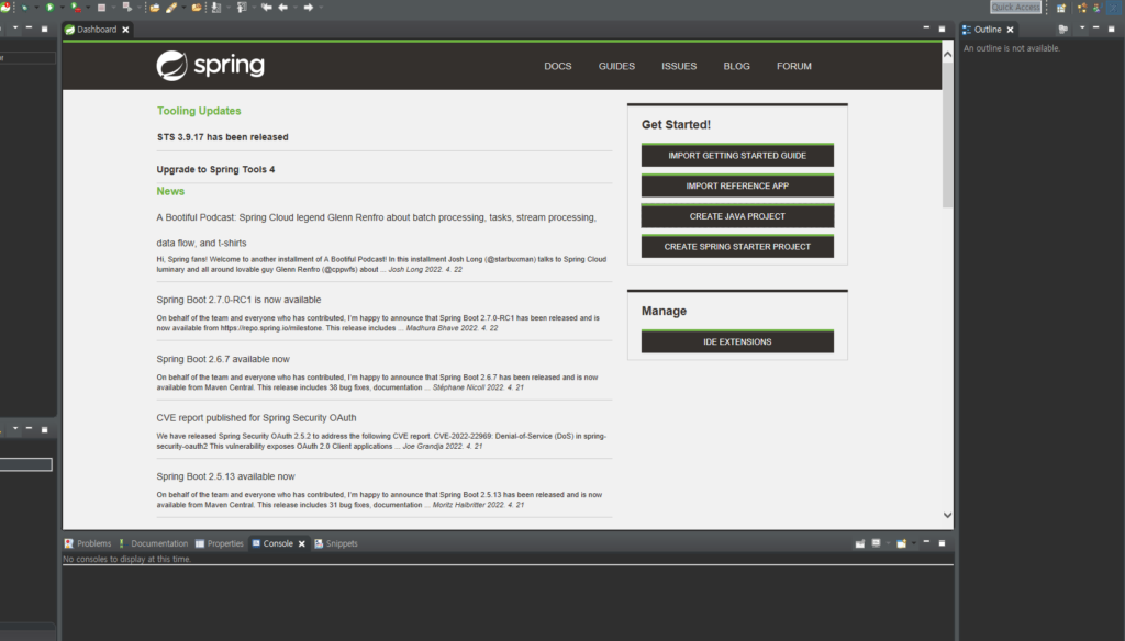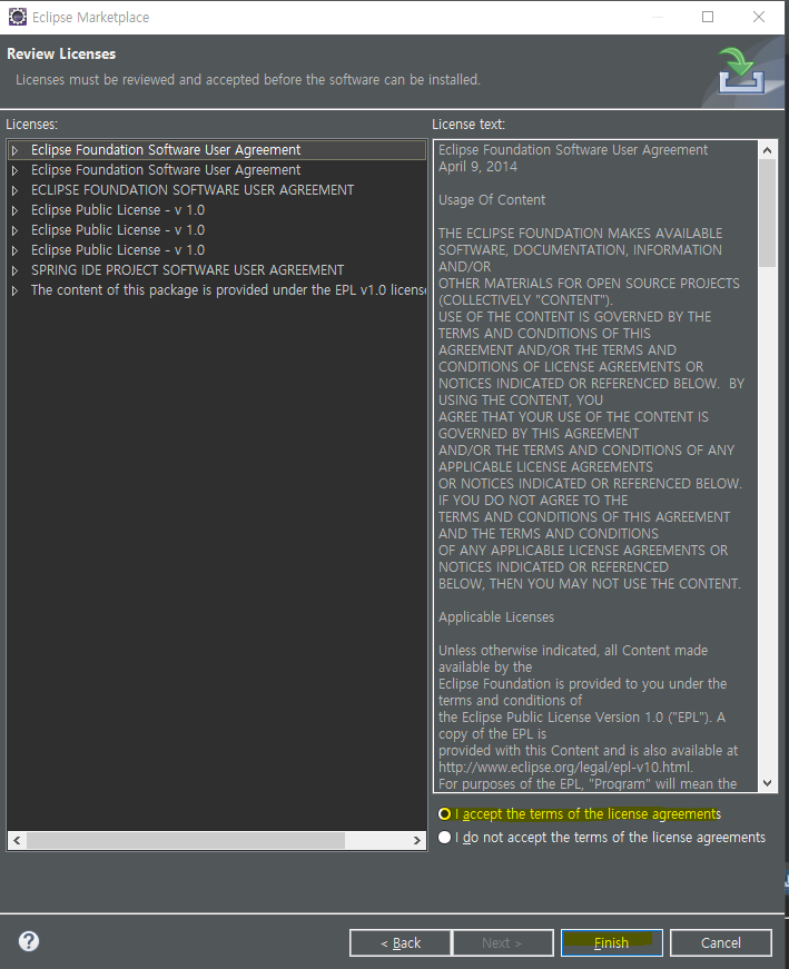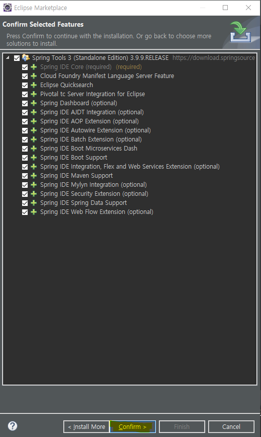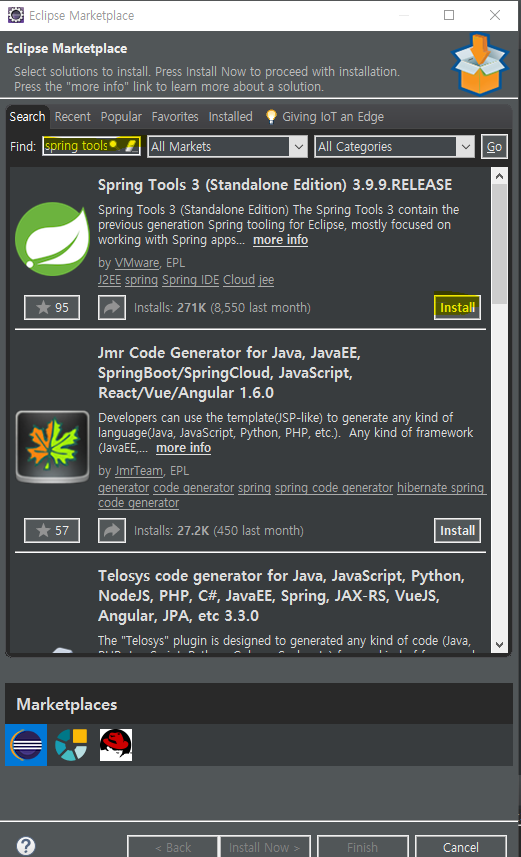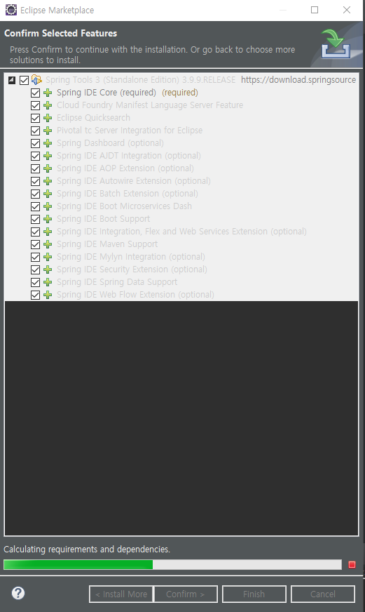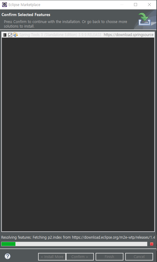 Eclipse에서 Spring 설치 2012년 12월 09일 golgol Spring/Flex 0 1.Help->Eclipse Marketplace 2.Spring Tools 3 -> Install 2.Spring Tools 3 -> Install 3. Fetching …………… 4. Select Features 4. Confirm Select Features 4. License agreement 4. Installing software 4. Complete