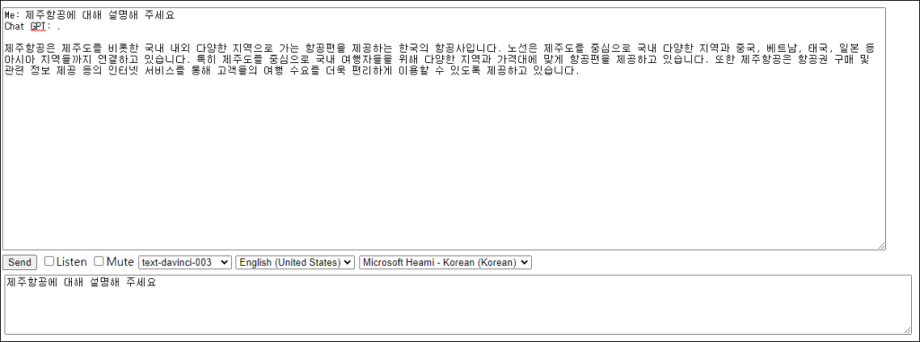 <!DOCTYPE html> <html> <head> <title>Chat GPT</title> <script src="ChatGPT.js?v=14"></script> </head> <body onload="OnLoad()"> <div id="idContainer"> <textarea id="txtOutput" rows="10" style="margin-top: 10px; width: 100%;" placeholder="Output"></textarea> <div> <button type="button" onclick="Send()" id="btnSend">Send</button> <label id="lblSpeak"><input id="chkSpeak" type="checkbox" onclick="SpeechToText()" />Listen</label> <label id="lblMute"><input id="chkMute" type="checkbox" onclick="Mute(this.checked)"/>Mute</label> <select id="selModel"> <option value="text-davinci-003">text-davinci-003</option> <option value="text-davinci-002">text-davinci-002</option> <option value="code-davinci-002">code-davinci-002</option> </select> <select id="selLang" onchange="ChangeLang(this)"> <option value="en-US">English (United States)</option> <option value="fr-FR">French (France)</option> <option value="ru-RU">Russian (Russia)</option> <option value="pt-BR">Portuguese (Brazil)</option> <option value="es-ES">Spanish (Spain)</option> <option value="de-DE">German (Germany)</option> <option value="it-IT">Italian (Italy)</option> <option value="pl-PL">Polish (Poland)</option> <option value="nl-NL">Dutch (Netherlands)</option> </select> <select id="selVoices"></select> </div> <textarea id="txtMsg" rows="5" wrap="soft" style="width: 98%; margin-left: 3px; margin-top: 6px" placeholder="Input Text"></textarea> <div id="idText"></div> </div> </body> </html> |