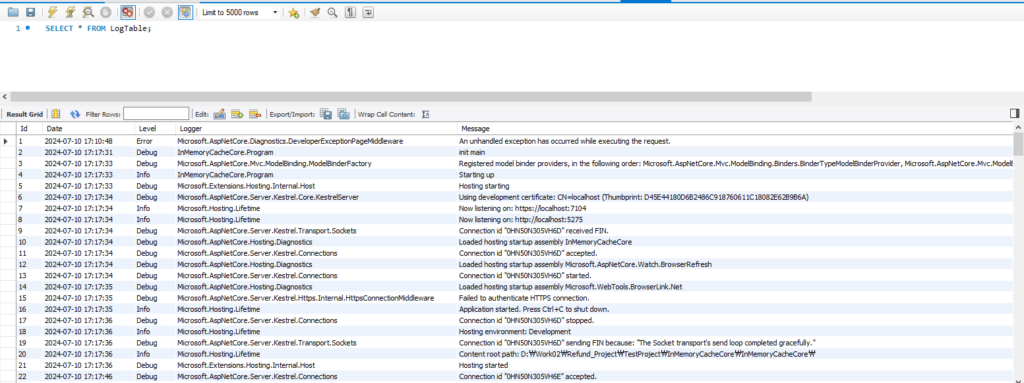 <?xml version="1.0" encoding="utf-8" ?> <nlog xmlns="http://www.nlog-project.org/schemas/NLog.xsd" xmlns:xsi="http://www.w3.org/2001/XMLSchema-instance" internalLogLevel="Debug" internalLogFile="internal-nlog.txt"> <!-- Include the NLog.Web.AspNetCore package --> <extensions> <add assembly="NLog.Web.AspNetCore" /> </extensions> <!-- Define the targets --> <targets> <!-- Log to a file --> <target xsi:type="File" name="logfile" fileName="logs/logfile.txt" layout="${longdate} ${uppercase:${level}} ${logger} ${message} ${exception}" /> <!-- Log to the console --> <target xsi:type="Console" name="logconsole" layout="${longdate} ${uppercase:${level}} ${logger} ${message} ${exception}" /> <!-- Log to a MySQL database --> <target xsi:type="Database" name="database" connectionString="Server=myServerAddress;Database=myDataBase;User=myUsername;Password=myPassword;" dbProvider="MySql.Data.MySqlClient.MySqlConnection, MySql.Data" commandText="INSERT INTO LogTable (Level, Logger, Message, Exception) VALUES (@level, @logger, @message, @exception)"> <parameter name="@date" layout="${longdate}" /> <parameter name="@level" layout="${level}" /> <parameter name="@logger" layout="${logger}" /> <parameter name="@message" layout="${message}" /> <parameter name="@exception" layout="${exception:tostring}" /> </target> </targets> <!-- Define the rules --> <rules> <!-- Log everything to file and console --> <logger name="*" minlevel="Trace" writeTo="logfile,logconsole" /> <!-- Log only errors to the database --> <logger name="*" minlevel="Error" writeTo="database" /> </rules> </nlog> |
