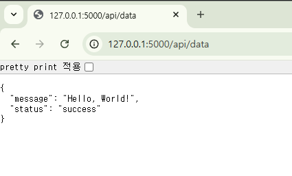 from flask import Flask, jsonify app = Flask(__name__) @app.route('/api/data', methods=['GET']) def get_data(): data = { "message": "Hello, World!", "status": "success" } return jsonify(data) if __name__ == '__main__': app.run(debug=True) |
